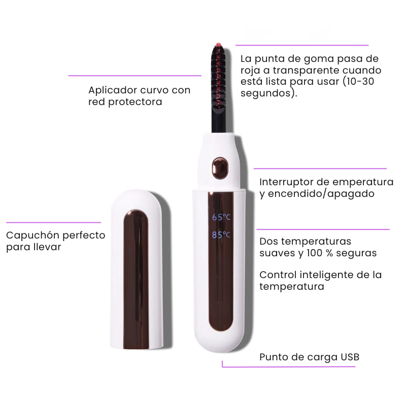 Este rizador de pestañas térmico realza tus pestañas en segundos, sin pinzas, sin tirones y sin riesgo de dañarlas.